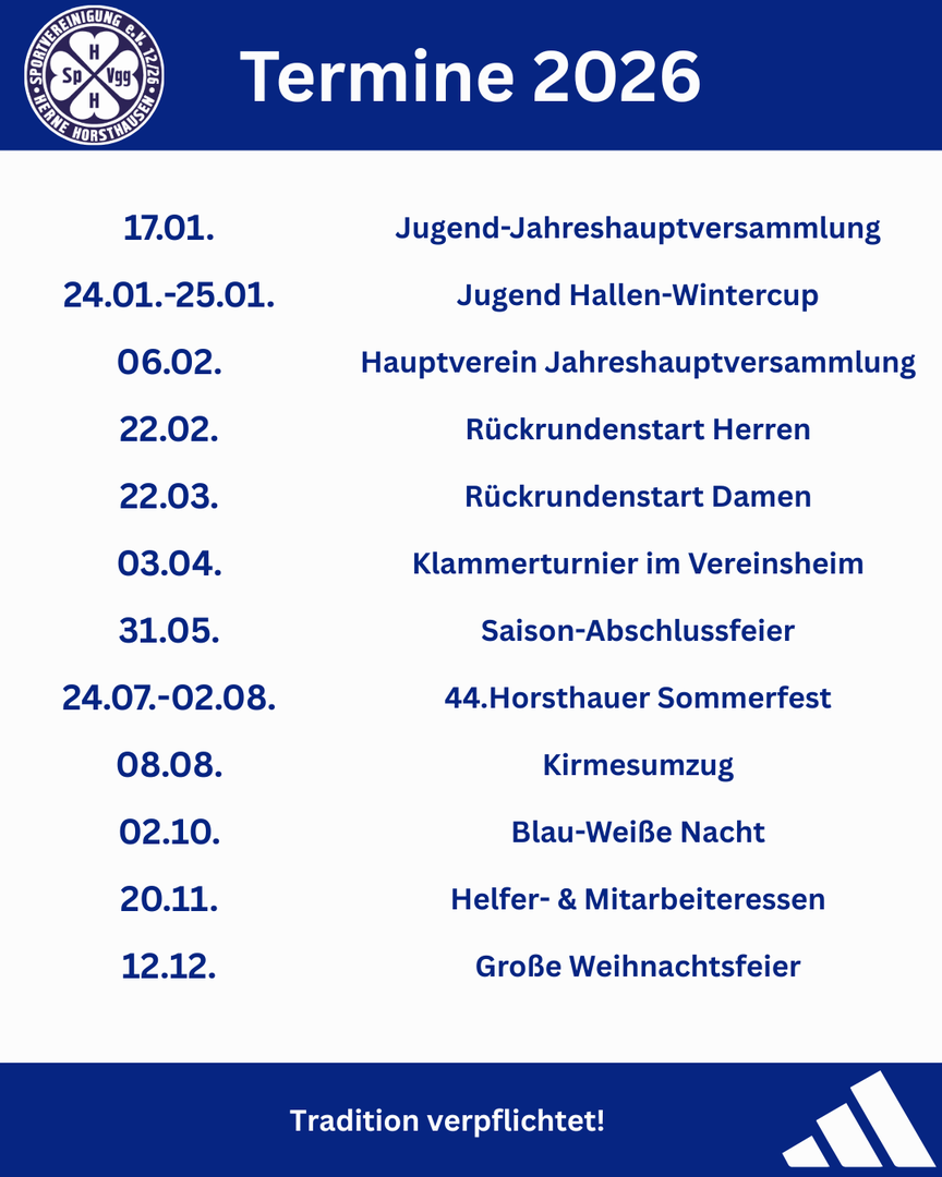 Die Trainingseinheiten, Spiele und Feste unserer Sportvereinigung Horsthausen 1912/26 e.V. sind öffentliche Veranstaltungen.
